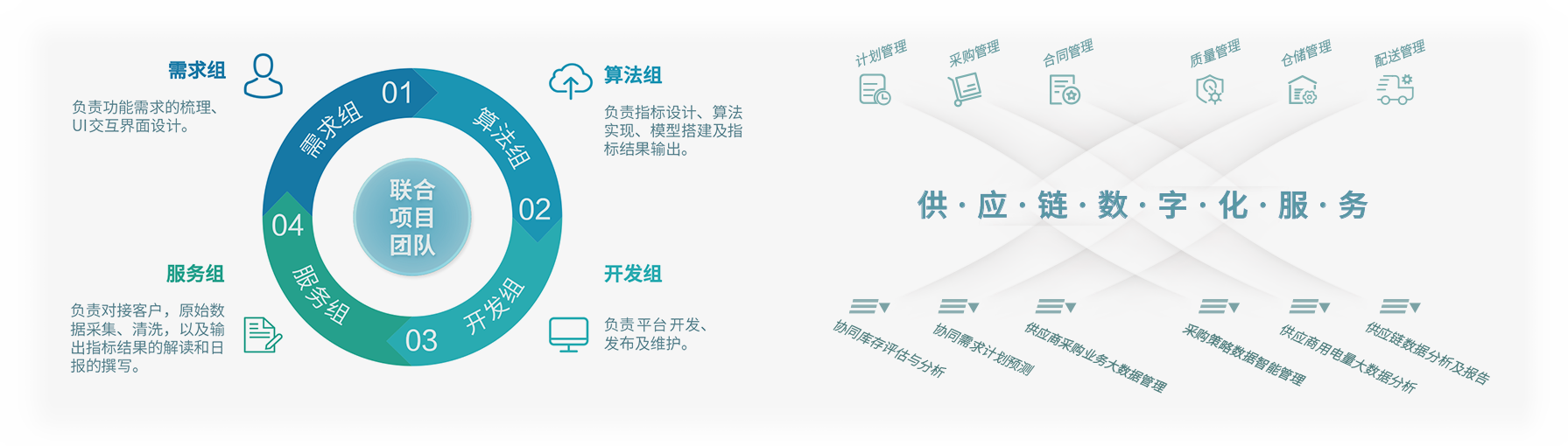 以“業(yè)務(wù)+技術(shù)”的工作模式,派駐數(shù)字化服務(wù)團(tuán)隊與客戶開展聯(lián)合辦公,通過提供業(yè)務(wù)診斷、工具開發(fā)、數(shù)據(jù)清洗、模型訓(xùn)練等服務(wù),幫助客戶將物聯(lián)網(wǎng)、人工智能、大數(shù)據(jù)分析等前沿技術(shù)嵌入其核心業(yè)務(wù)流程,助力客戶企業(yè)以更快速度、更大規(guī)模推動供應(yīng)鏈發(fā)展與變革。